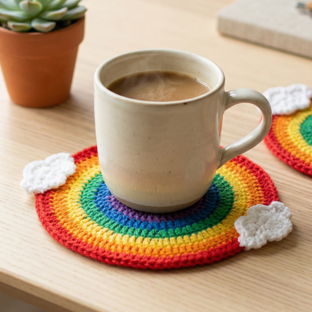 A rainbow-inspired coaster is bright, happy, and easy to customize. It can be made in full rainbow colors or in a softer pastel palette, depending on the mood you want. This design is cheerful enough for a child’s room, a gift basket, or a colorful kitchen set.