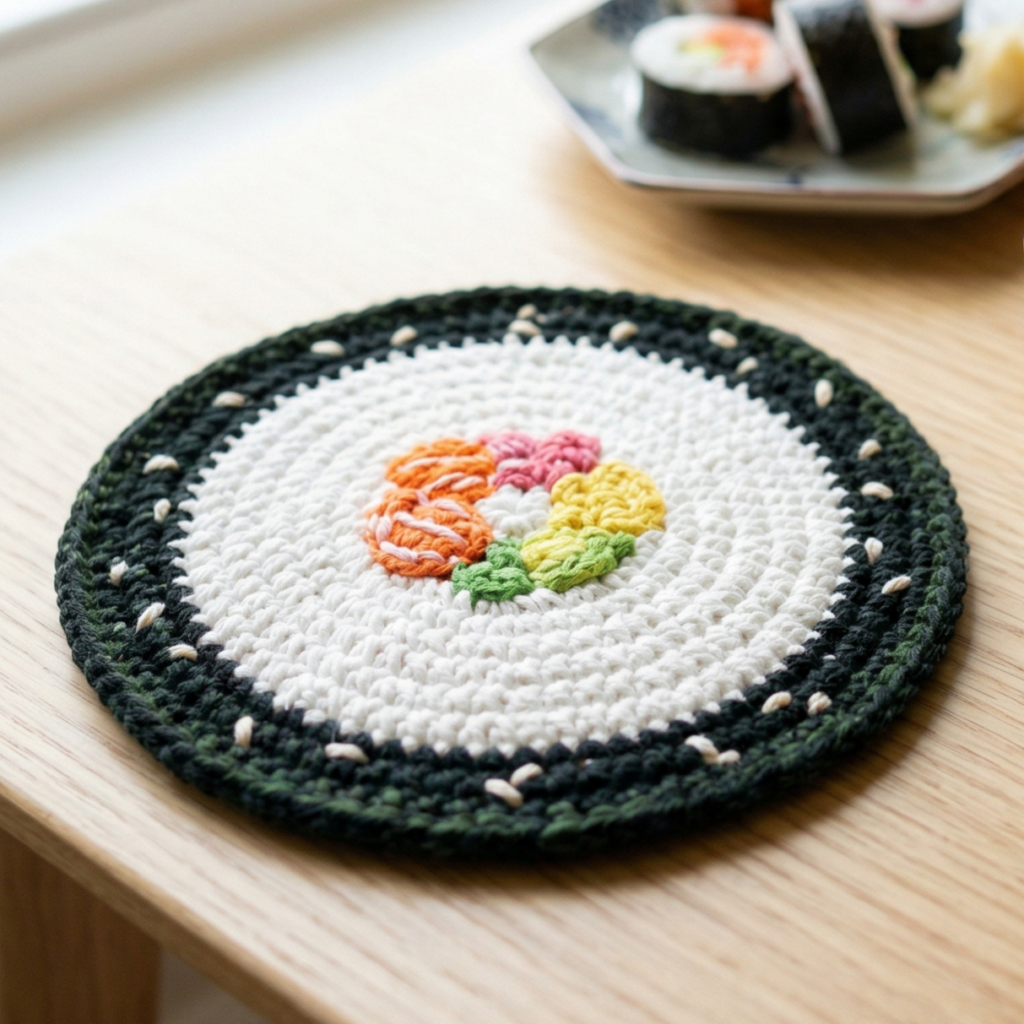 If you want a more realistic sushi vibe, add a few tiny white stitches or speckles on the black border to mimic sesame seeds. Keep them sparse so the coaster does not become too busy.