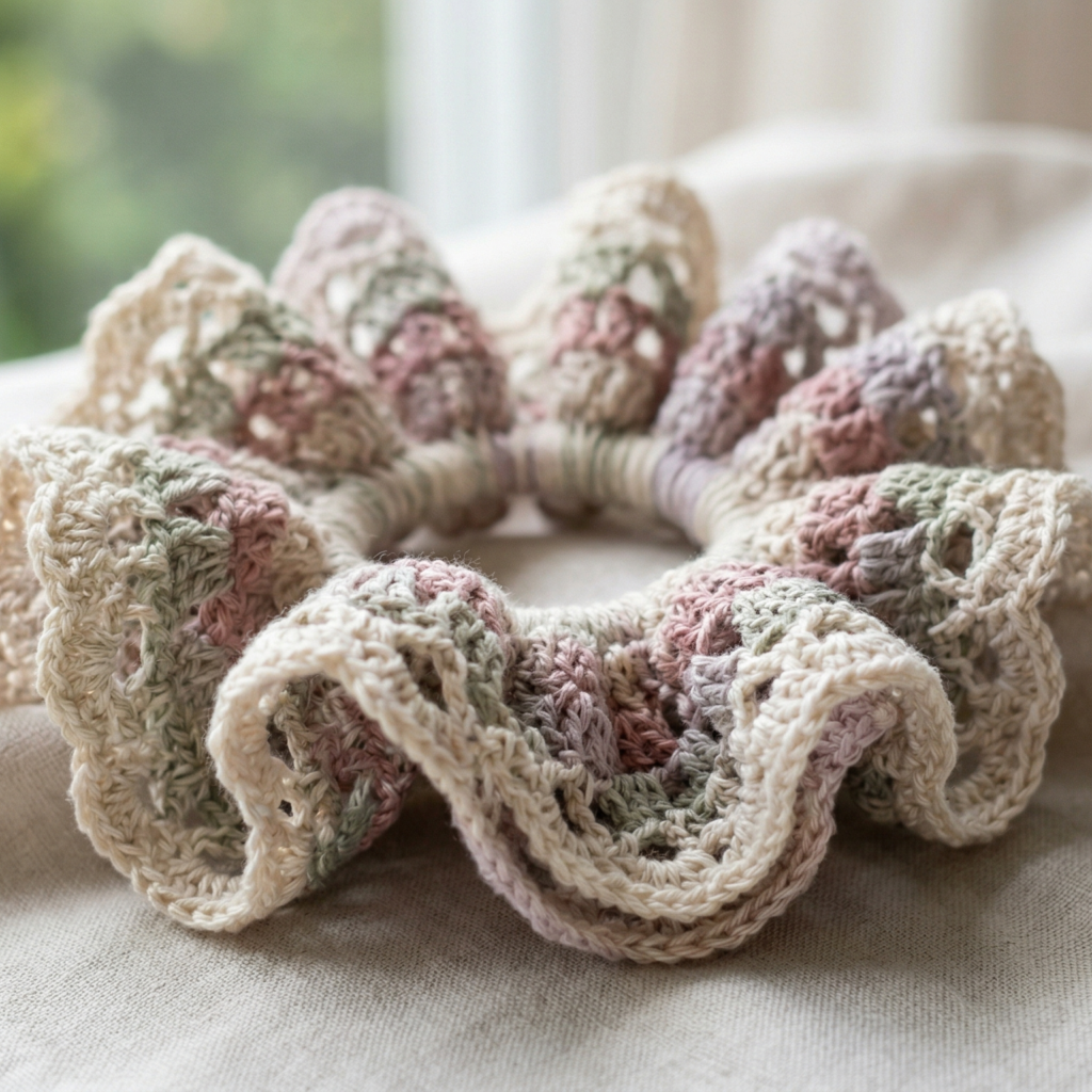 This scrunchie looks especially beautiful in fine cotton yarn because the picots show up clearly. Soft neutrals, dusty pink, lavender, and cream all work beautifully. It is a lovely choice if you want a scrunchie that feels delicate but not fragile.