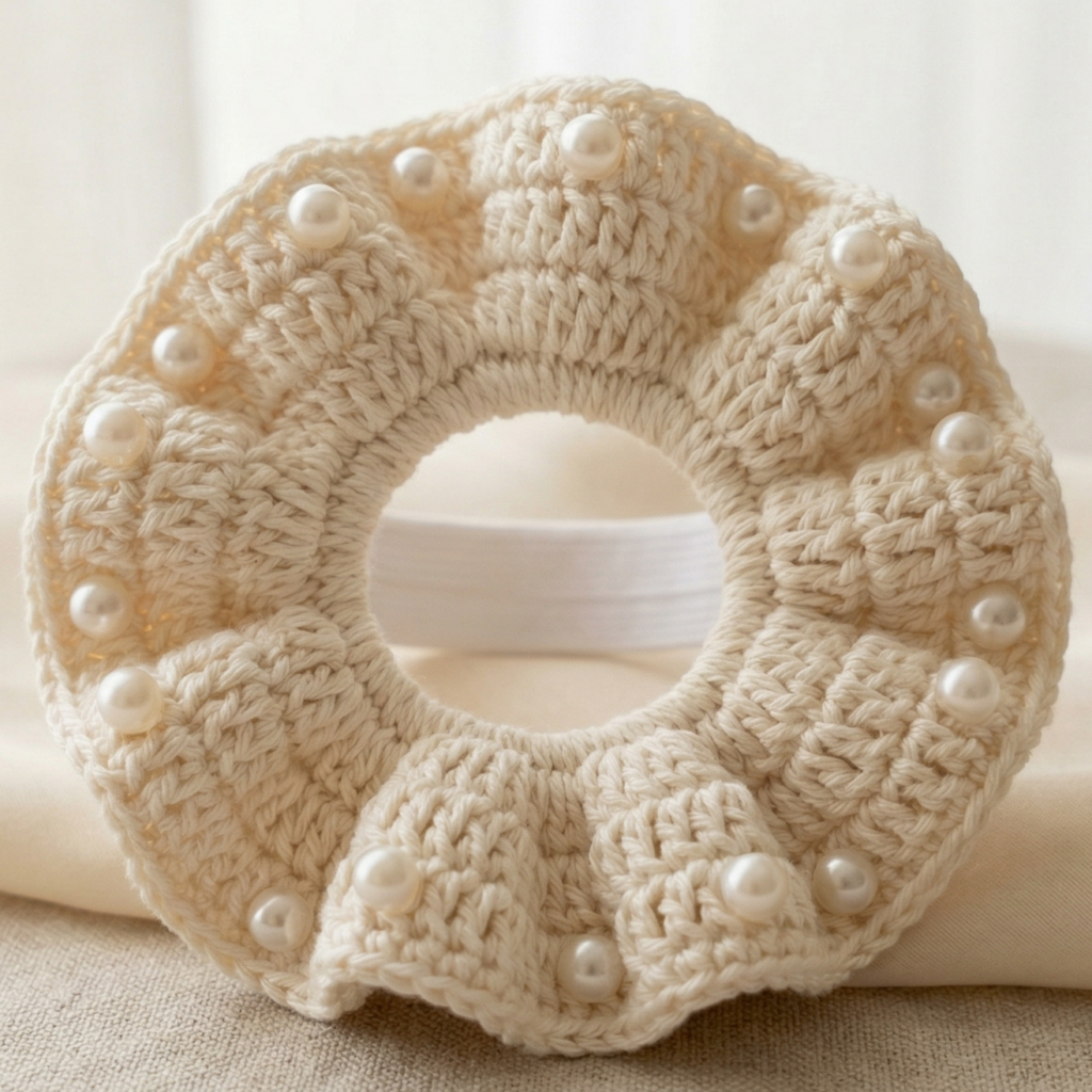 Use a stitch pattern that creates volume, such as clusters, shells, or repeated rows. Vintage styles often look lovely when the scrunchie feels soft and slightly fluffy. This fullness gives the pearls a beautiful surface to sit on.