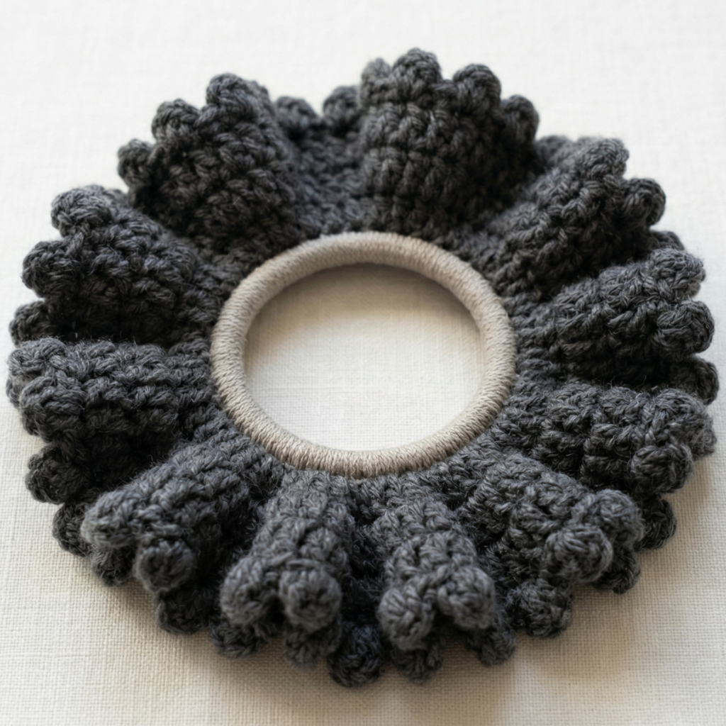 If you want the scrunchie to feel extra fluffy, work a second round or layer of stitches under the picot edge. This adds volume and helps the picots stand out. The body should remain soft so it can wrap comfortably around hair.