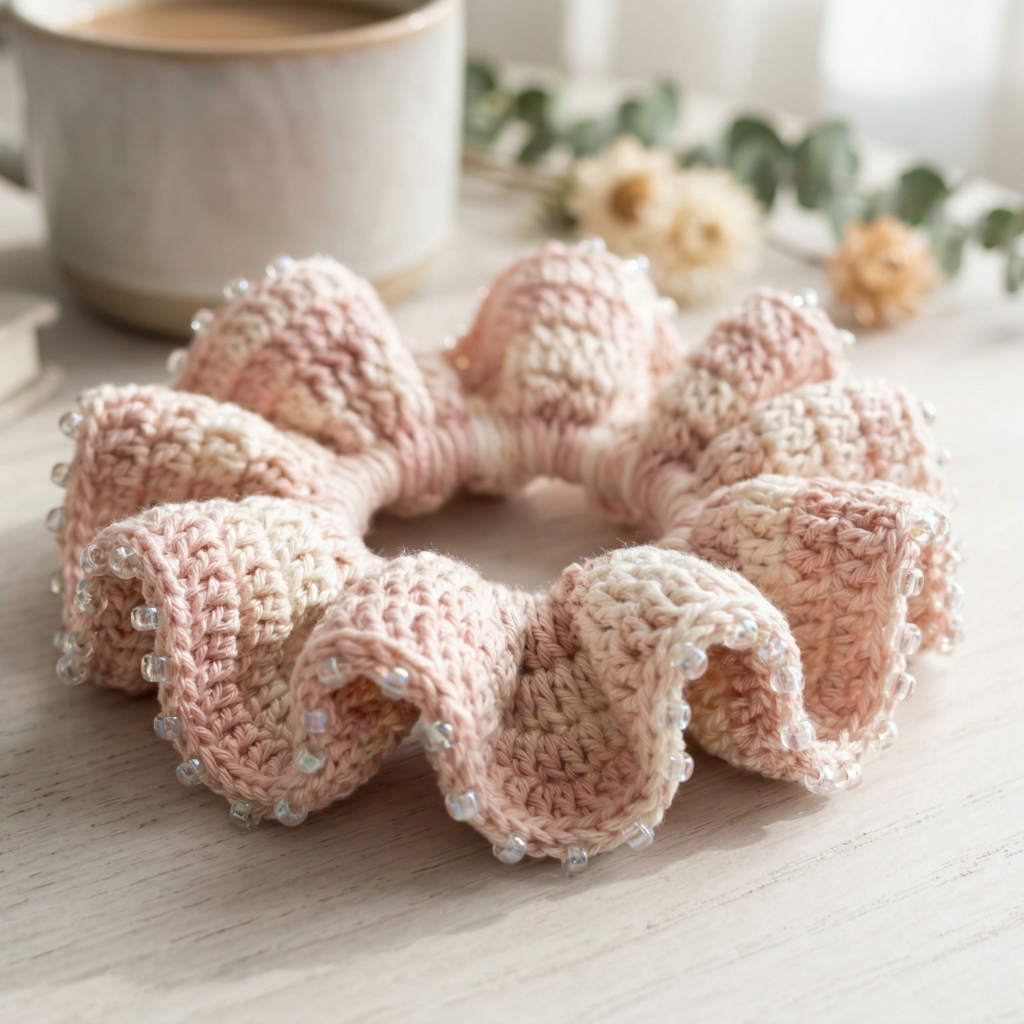 A crochet scrunchie with beads feels elegant, polished, and just a little dressy. The beads add movement and sparkle without making the scrunchie too heavy, which makes it perfect for everyday styling or for dressing up a simple hairstyle. This design works beautifully for anyone who wants a scrunchie that feels a little more special than a plain one.