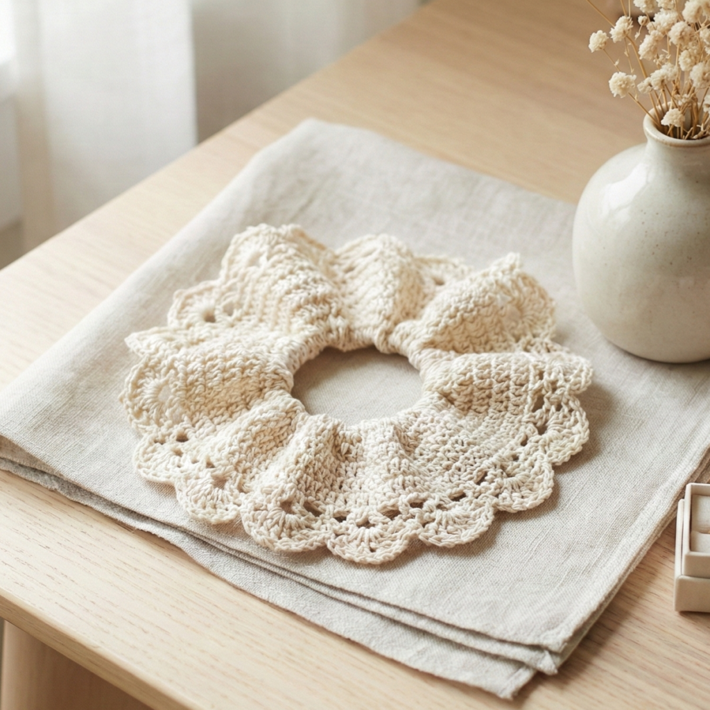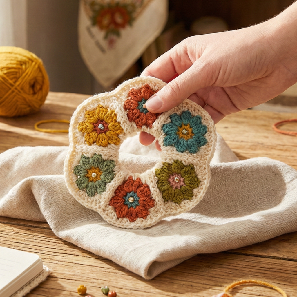 - Make motif(s) and attach to pre-made plain scrunchie: crochet flower appliqués or granny motifs, then sew them onto a ready-made basic scrunchie. Fast and customizable.