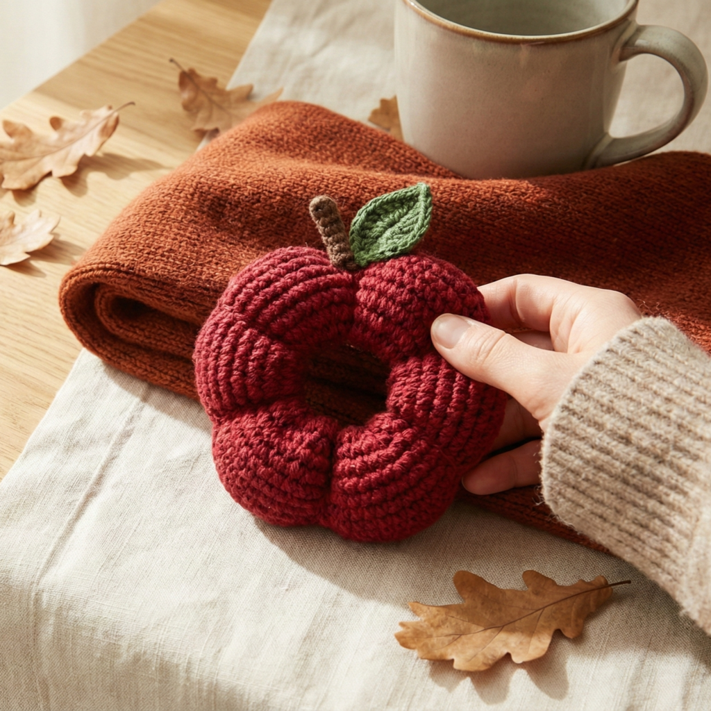 Crochet a plain tube for elastic, make a small stuffed puffy apple centre (two circles joined and lightly stuffed) or a flat appliqué, create a tiny leaf and stem, and stitch onto scrunchie.