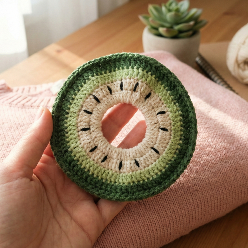 - Tapestry needle, stitch markers, small amount of stuffing (for apple/kiwi centres if you want puff), optional seed beads or tiny buttons, and small scissors.