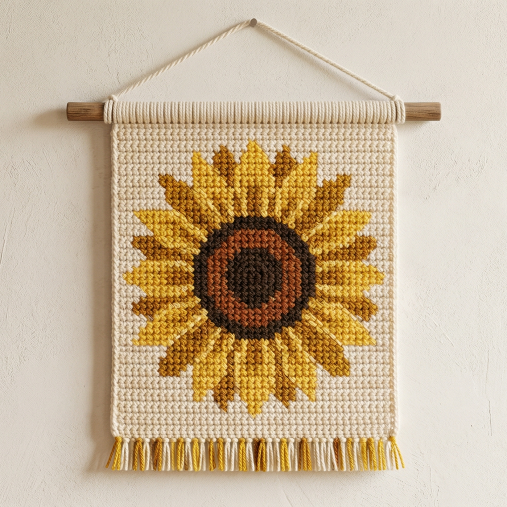 Since this wall hanging should stay small or medium, avoid making the flower too large or too many rows too tall. The sunflower should feel like a mini accent piece rather than a giant tapestry.