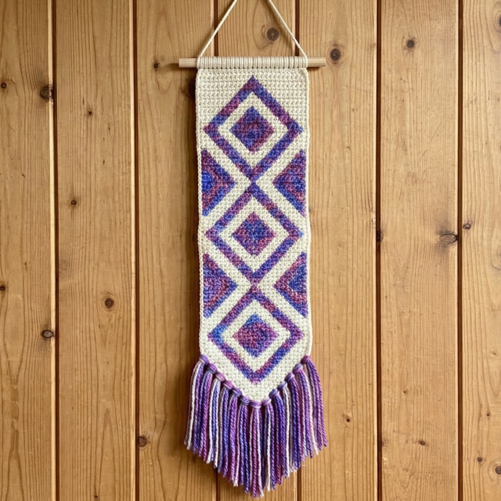 A diamond daze wall hanging is clean, geometric, and visually striking. The diamond shapes create movement and structure, making it a perfect choice if you want a wall hanging that feels modern but still handmade. Since the piece stays small or medium, the repeating diamond motifs can shine without overwhelming the wall.