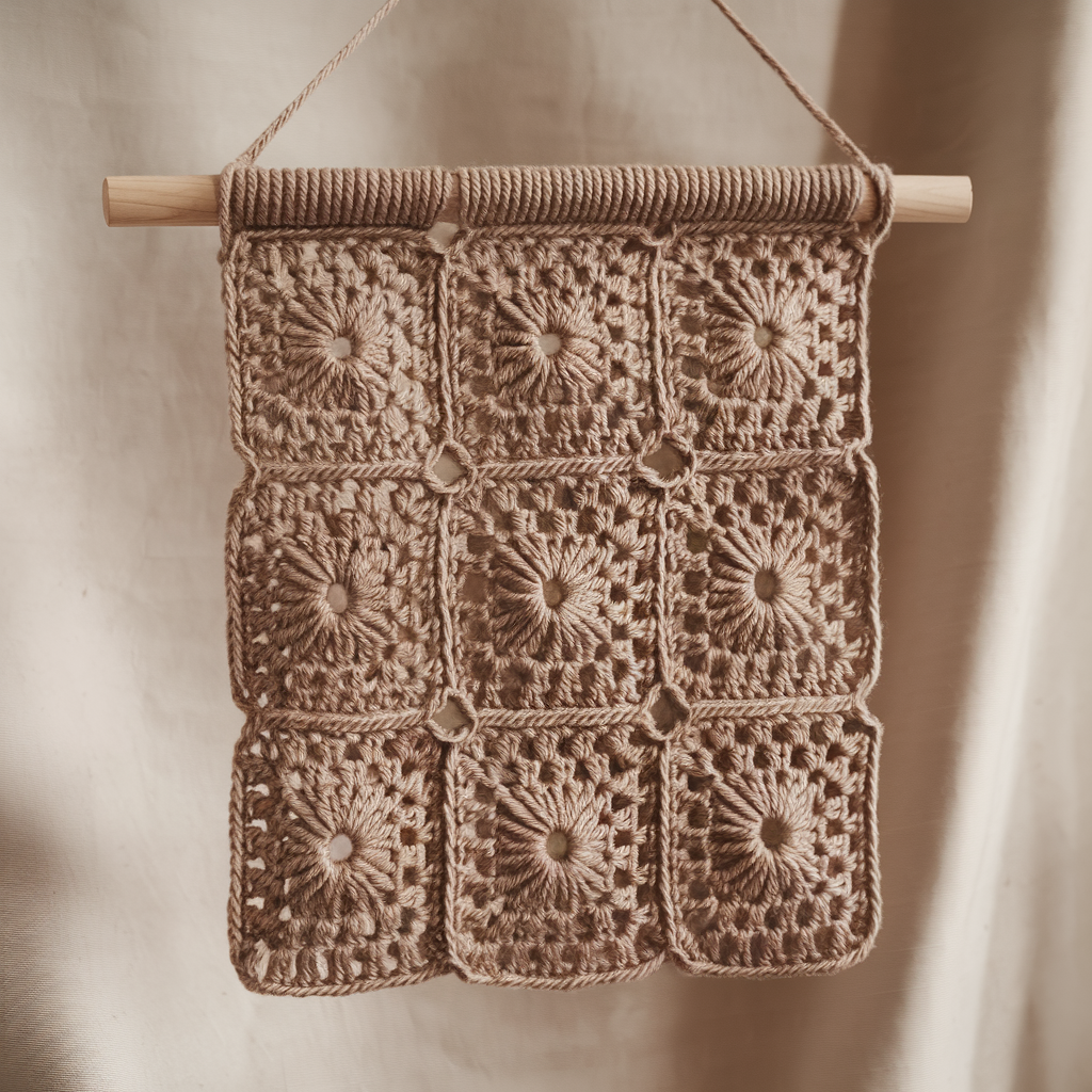 - Top row & hanging loop. Work one round of sc around the entire rectangle to tidy edges. On the top edge, make two or three small sl st loops spaced evenly and attach cord for hanging or leave ends to wrap around your dowel. Alternatively, fold the top over the dowel and sew a pocket: fold top edge down about 1″–1.5″, whipstitch through both layers to form a channel for the dowel.