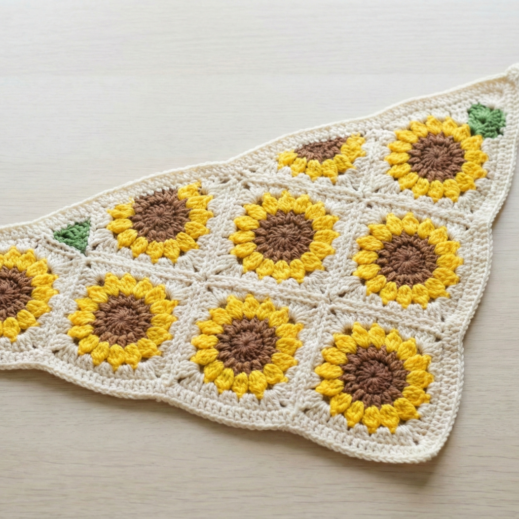 A charming bandana where each granny square is a tiny sunflower — perfect for sunny spring/summer styling.