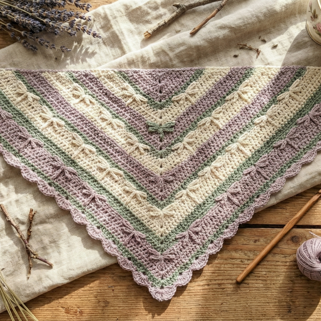 Vintage-inspired tiny dragonfly (or seed) stitch motif repeated across the triangle for a whimsical, nature-y look.