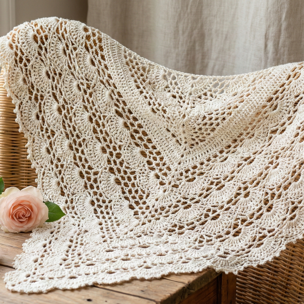 Use a simple repeating lace motif like ch-3 arch + shell to create airy openness. Repeat of 8–10 stitches is common.