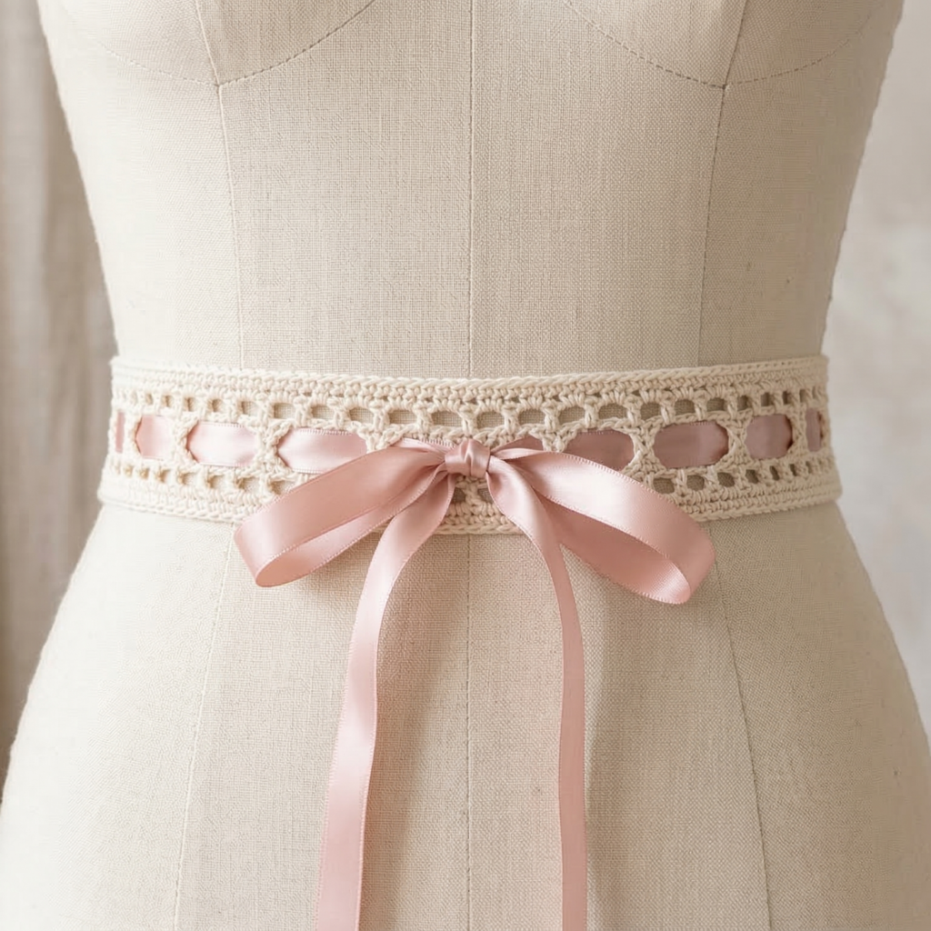 Yarn & hook: Sport/DK mercerized cotton for sheen and drape (150–200 yds). Hook 3.5 mm. Ribbon: 1/2–1 in wide satin ribbon.