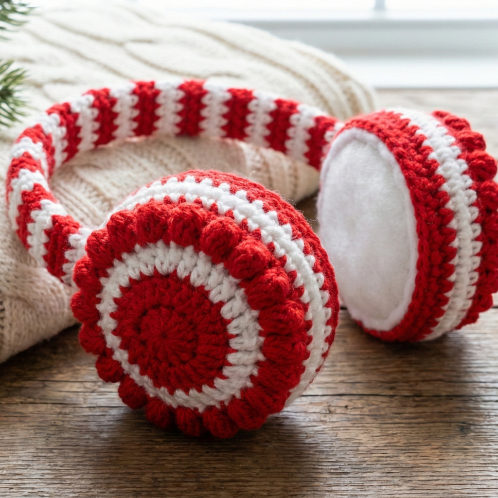 Bright, candy-stripe ear muffs inspired by peppermint candies — fun for holiday outfits. Uses bold red & white stripes and optional bobble edges like sugared rim.