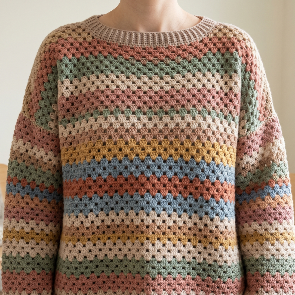 A granny striped oversized pullover feels relaxed, colorful, and full of handmade charm. The granny stitch gives it a classic crochet look, while the oversized silhouette makes it easy to wear and style. This is a wonderful sweater if you love a cozy, slightly vintage feel with modern comfort.