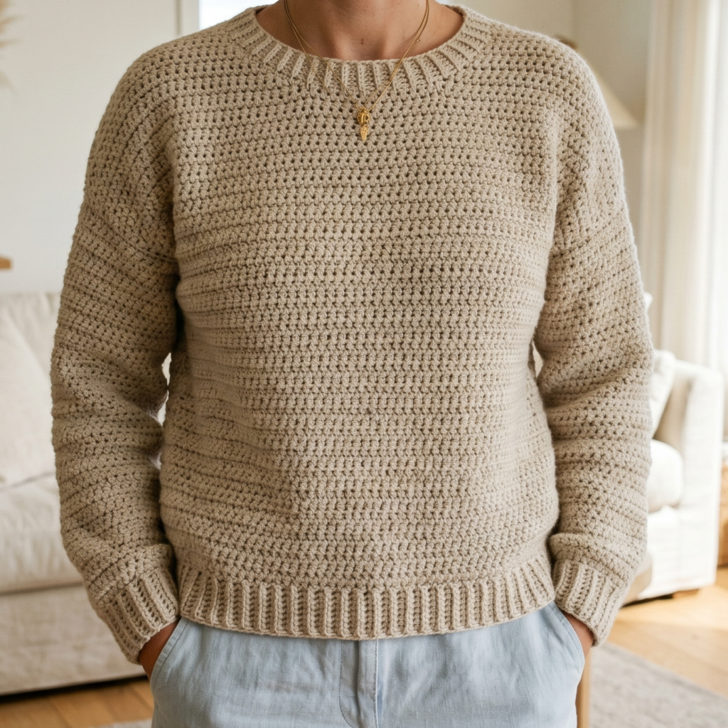 This sweater looks especially good in earthy neutrals, olive, camel, gray, or deep navy. If you want a more modern wardrobe staple, choose a single rich color and let the texture do the talking. It is a beautiful pullover for anyone who loves tactile, timeless crochet.
