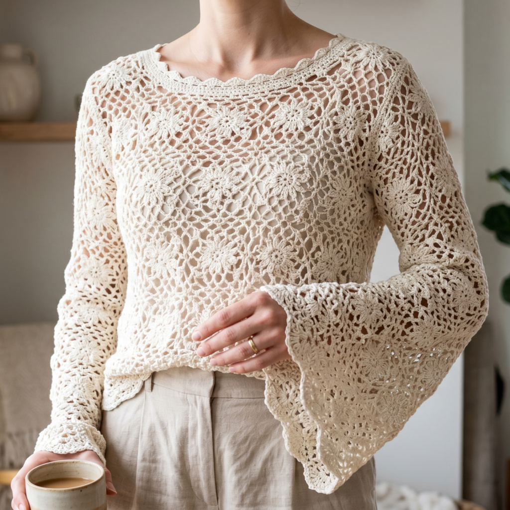 Choose a yarn that flows nicely and does not feel too stiff. Cotton blends, soft acrylics, or lightweight wool blends work beautifully for flared sleeves because they allow the fabric to hang naturally. A soft, medium-tone color usually works well.
