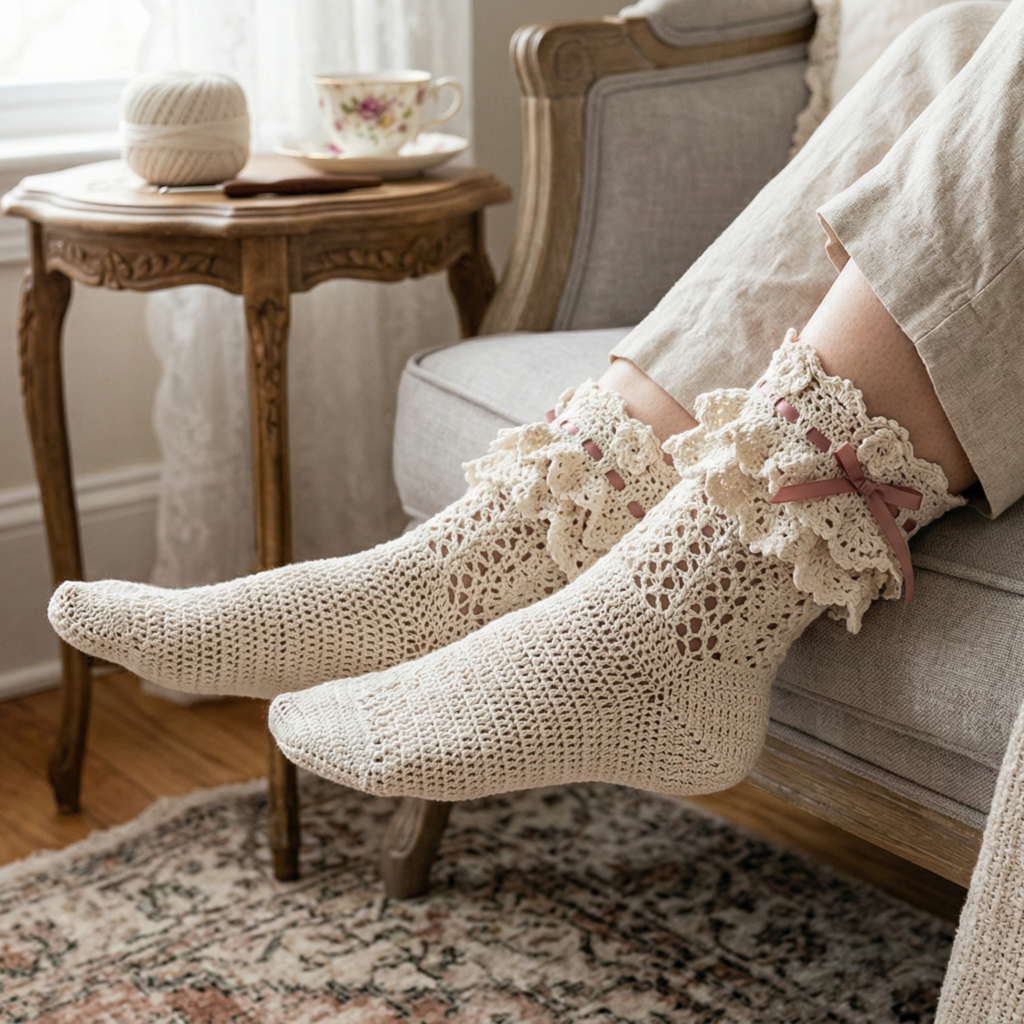Ruffle ankle socks are playful, soft, and feminine. The ruffled edge adds a decorative touch that makes them feel more like cozy loungewear than basic socks. They are perfect for beginners who want something stylish without overly complex shaping.