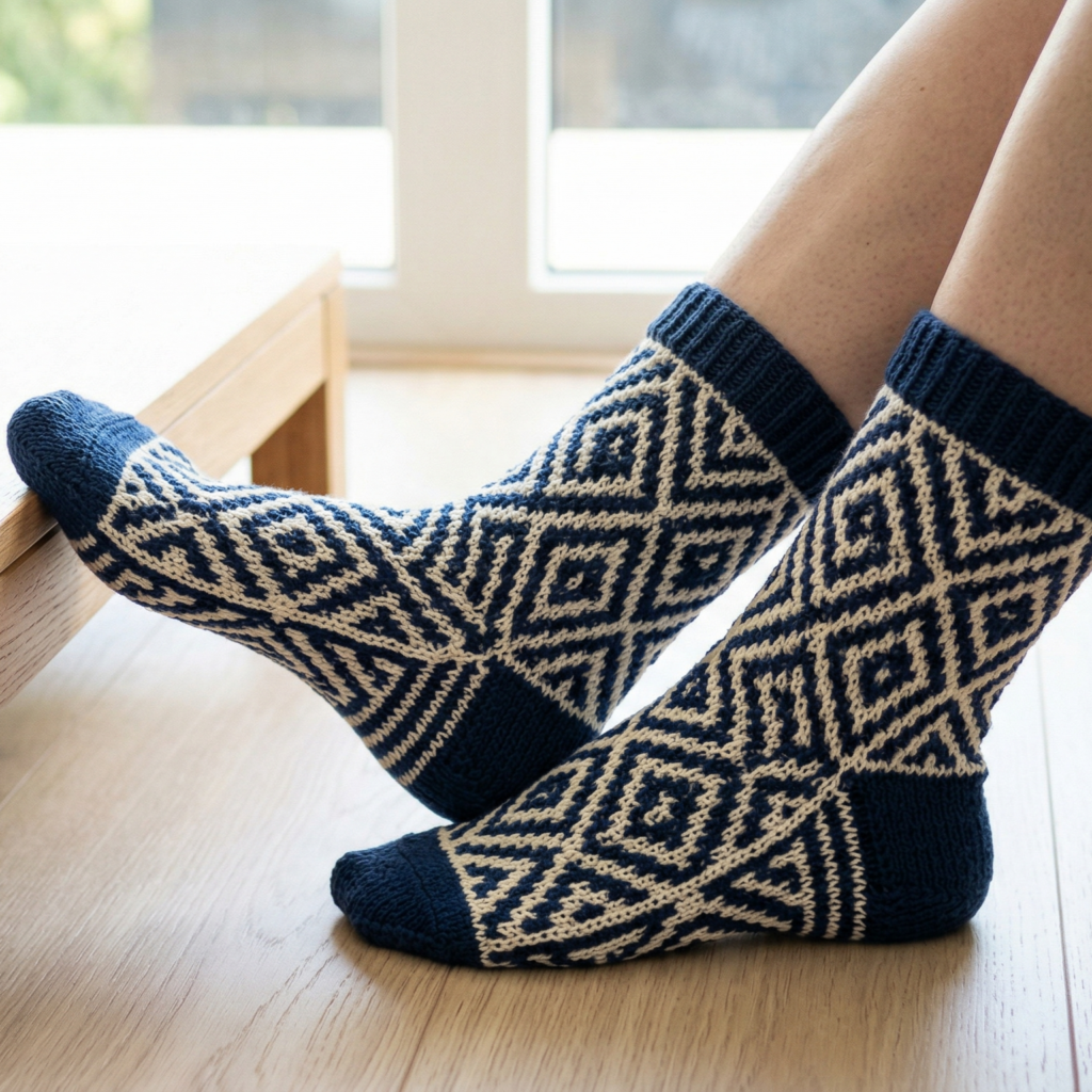 Mosaic socks are bold, geometric, and visually striking. They use colorwork techniques to create intricate-looking designs without carrying multiple strands at once.