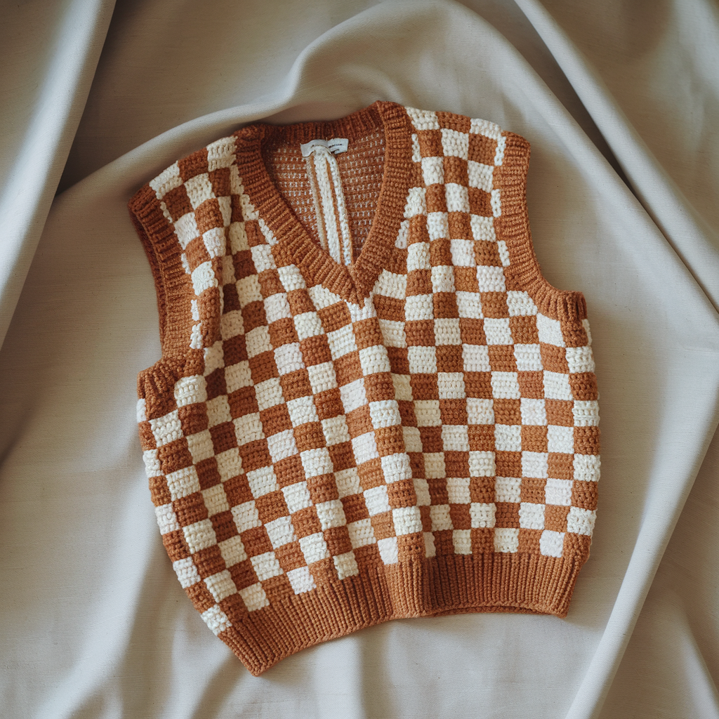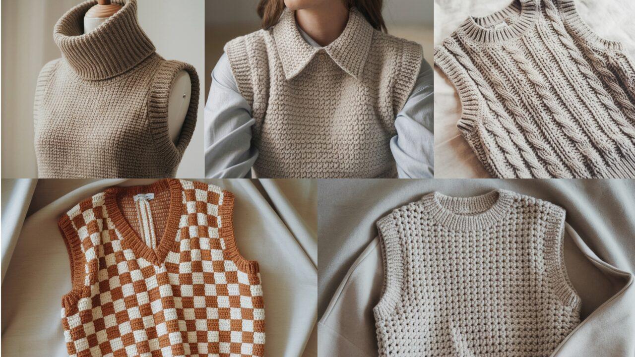 These five sweater vest designs give you a full range: bold geometric checkerboard, cosy turtleneck, sculptural cable panels, rapid chunky makes, and preppy collared styles. Each pattern is designed to be adaptable — change yarn weight or hook for fitted vs. oversized vibes, and tweak length or ease to match your wardrobe.