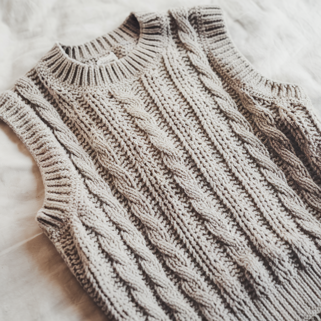 - Repeat rows to build vertical cable columns, crossing every 6–8 rows to form the cable twist. Continue until desired vest length.