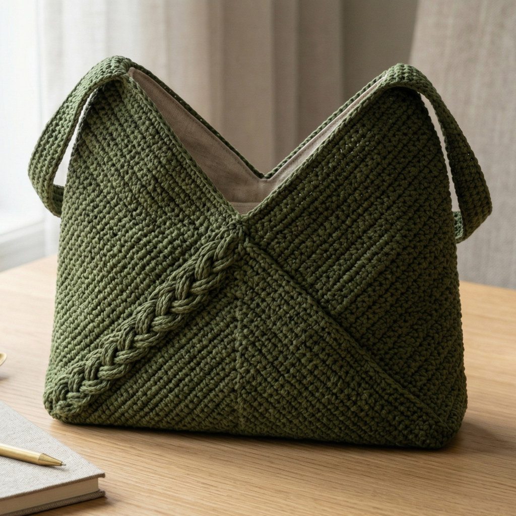 Work the bag body in flat pieces or structured sections. Keep the fabric firm and even so it can hold the folded look. Simple stitches are often the best choice because the shape itself is the main feature of the design.