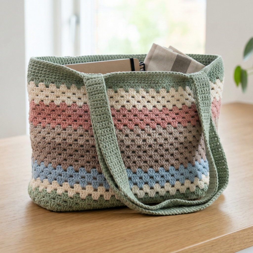 A granny stripes tote bag brings classic handmade charm into a practical shape. Granny stitch has a nostalgic feel that many crocheters love, and when it is used in stripes, it creates a colorful, cheerful tote bag that feels both retro and modern. This is a great project for using leftover yarn while still creating something stylish enough to carry every day.