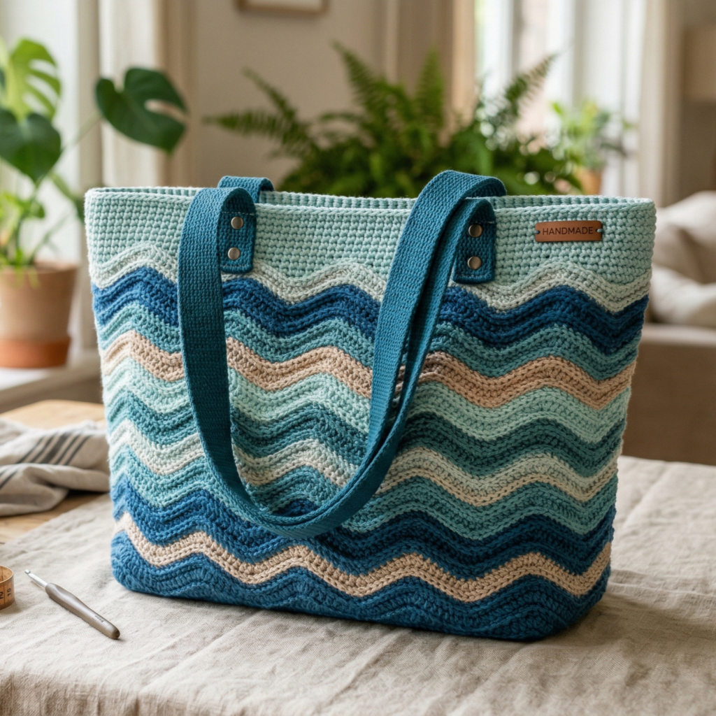 A waves tote bag is a beautiful way to add movement and texture to a practical everyday accessory. The flowing wave design gives the bag a lively look that feels fresh and stylish, while the tote shape keeps it useful for daily errands, books, or shopping. It is a perfect project if you want something eye-catching without making the construction too complicated.