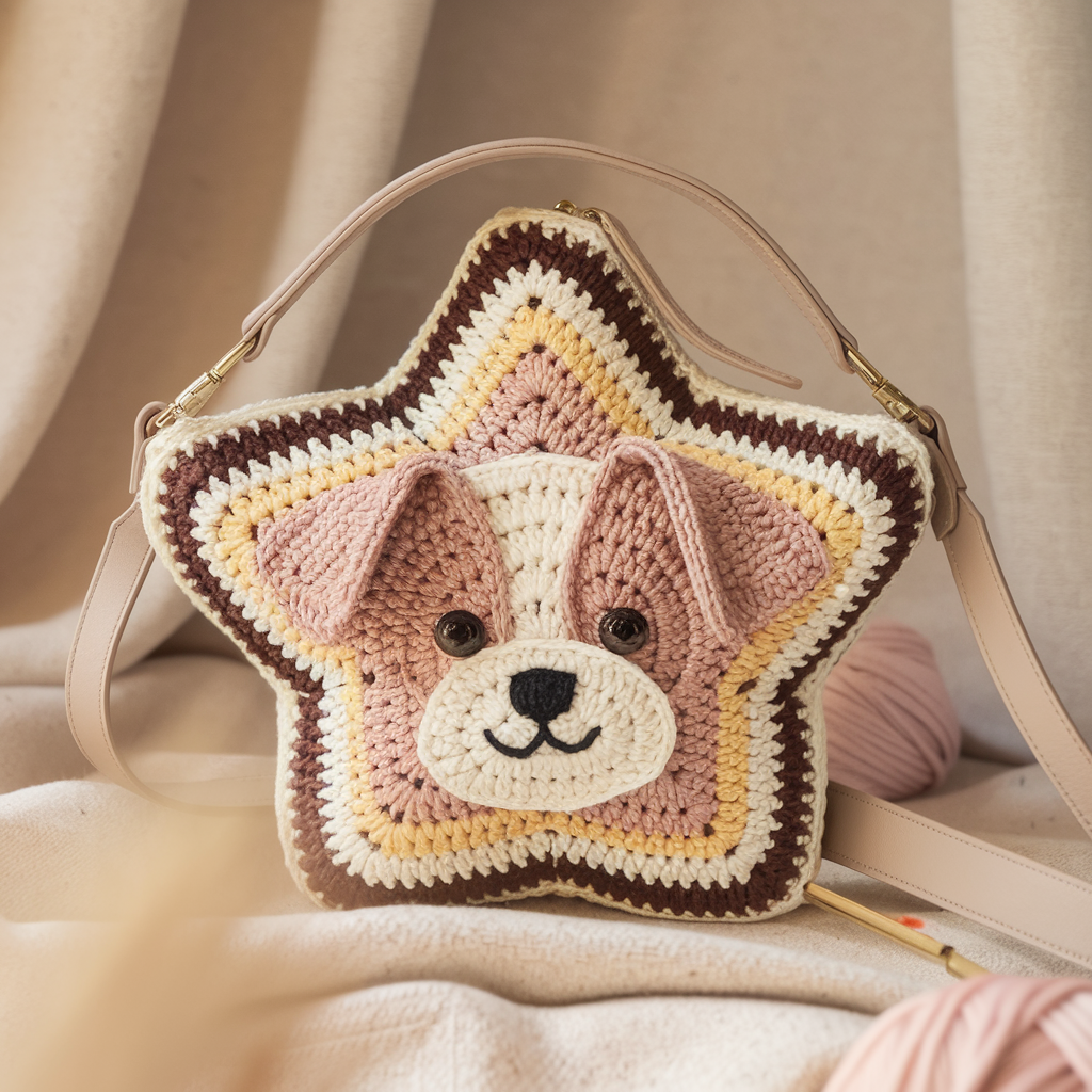 Materials: worsted cotton in main color for star, contrast for puppy face (cream, brown, black), 4.5–5.0 mm hook, 1 small zipper for top, crossbody strap hardware (D-rings + strap or crocheted strap), lining fabric for a small bag, polyester stuffing for face applique if you want 3D features. Yarn ≈ 400–600 yds.