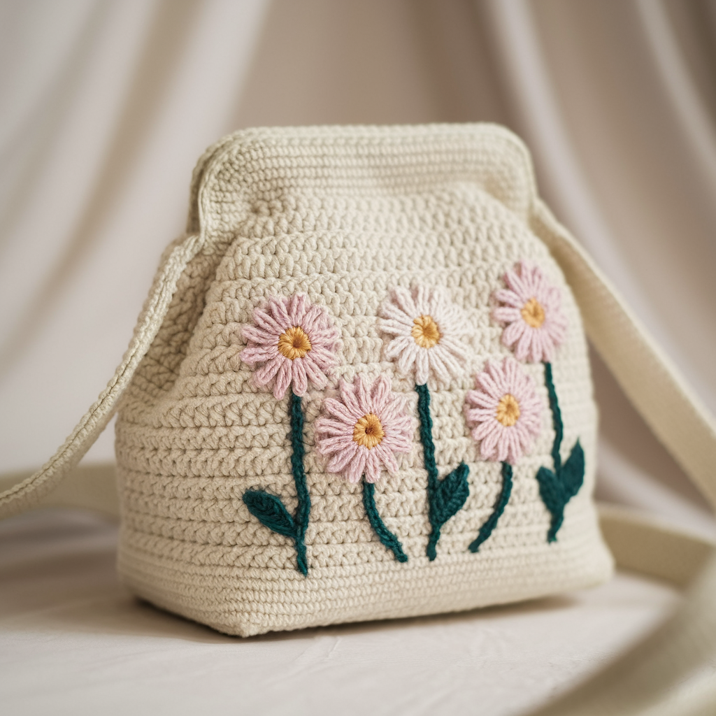 Materials: worsted cotton or cotton-blend in cream, 4.0–4.5 mm hook, embroidery floss in 2–3 colors (petal/leaf/center), tapestry needle, lining fabric, optional leather strap or chain strap (for fancy vibe). Yarn ≈ 600–900 yds.