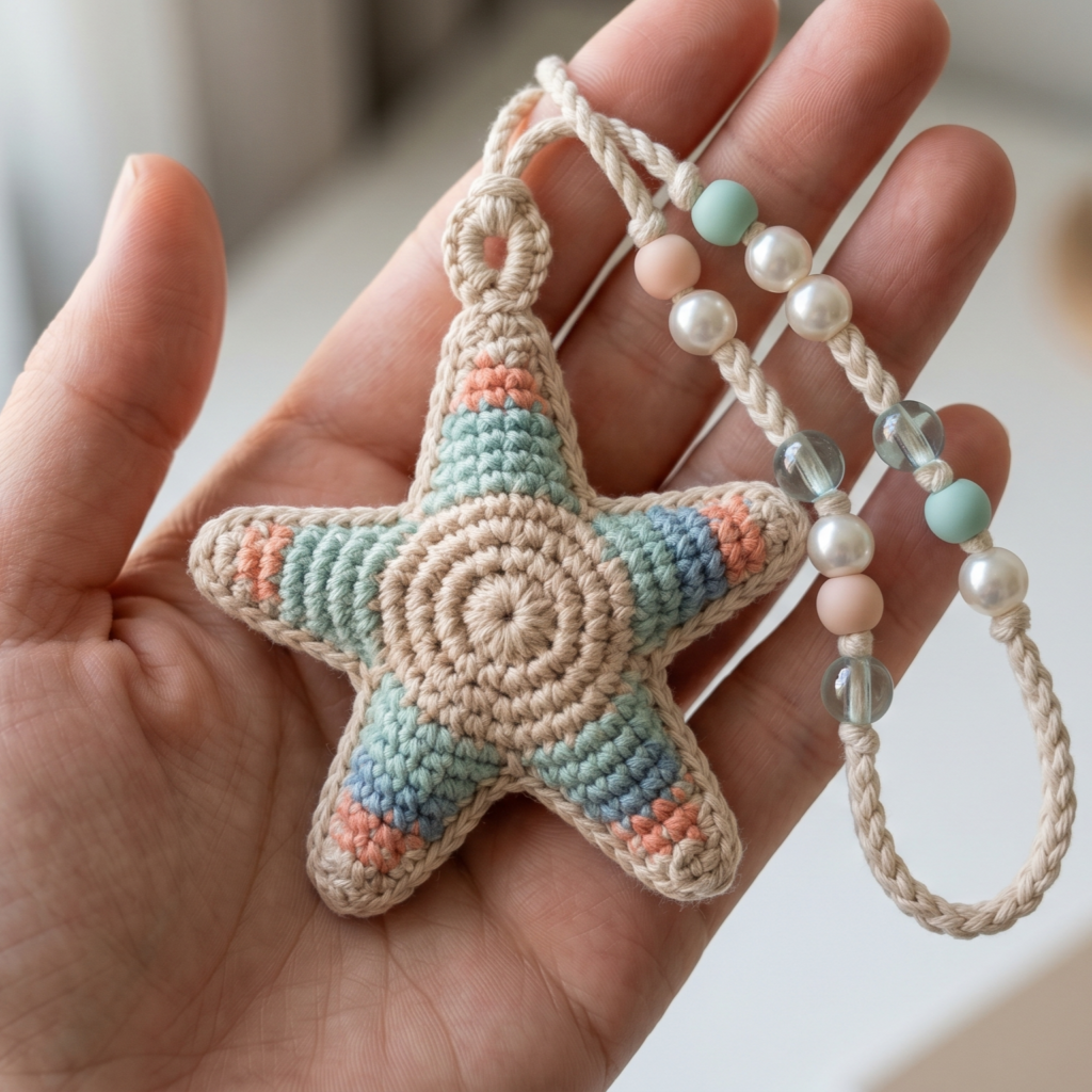 Add a strong loop at the top so the charm can be clipped to a keychain or bag. Reinforce the top carefully because the starfish will hang from this point.