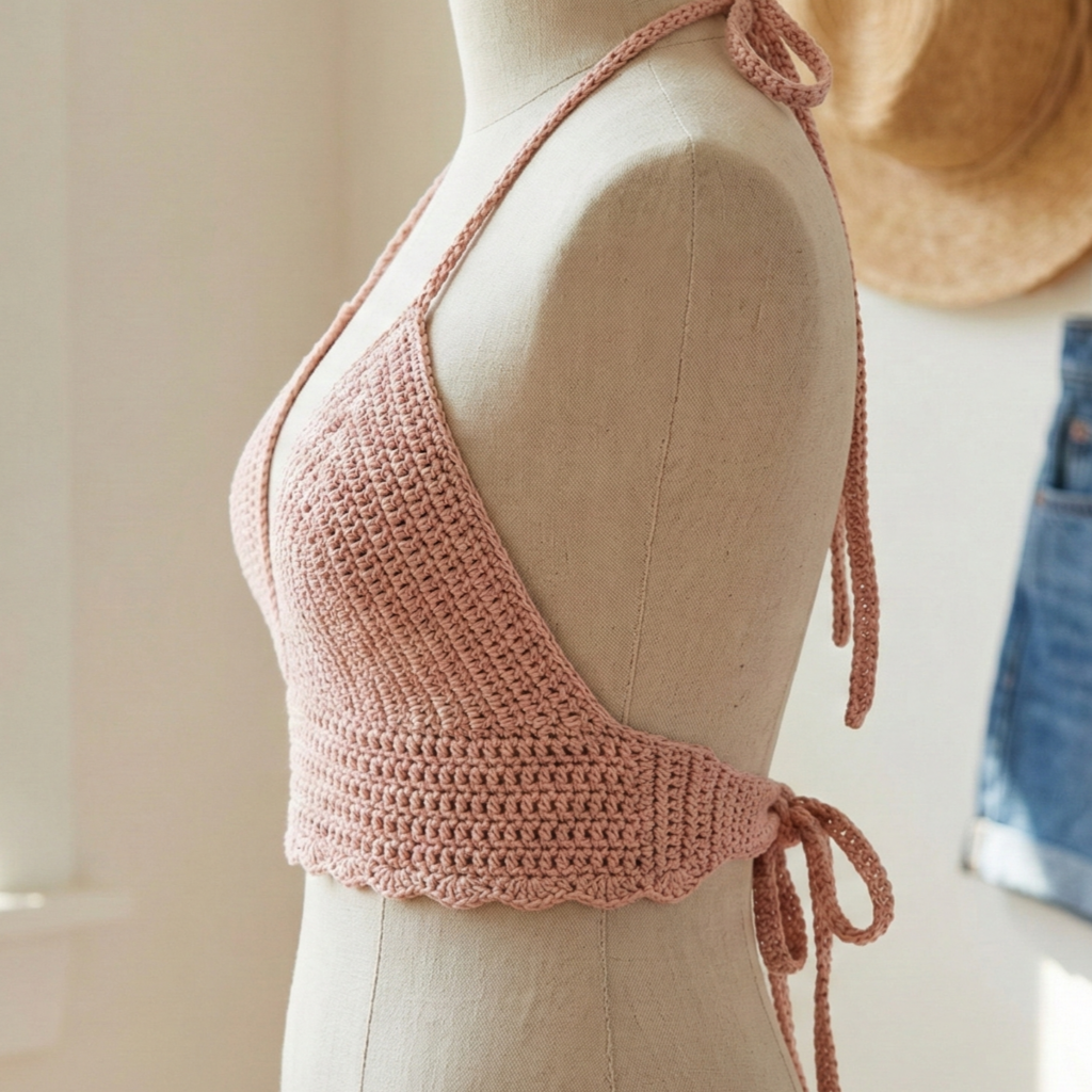 - For fuller busts, make wider triangles and a stronger underbust band (work two strands held together or hdc BLO for dense support).