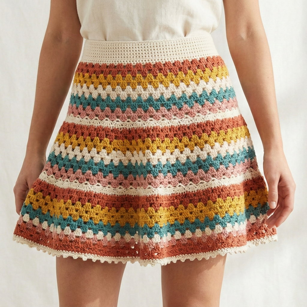 Worked top-down: a firm waistband (sc or hdc), then attach tiers of granny-stripe rounds. Each tier is wider than the one above to create ruffles. This skirt is forgiving and fun to customize.