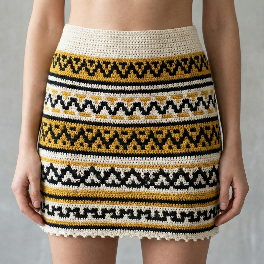 Use mosaic crochet or simple tapestry single crochet to create graphic panels (stripes, geometrics, or repeat motifs). Work the skirt top-down in the round with charted colorwork rows, and reinforce the waist with a firm band.