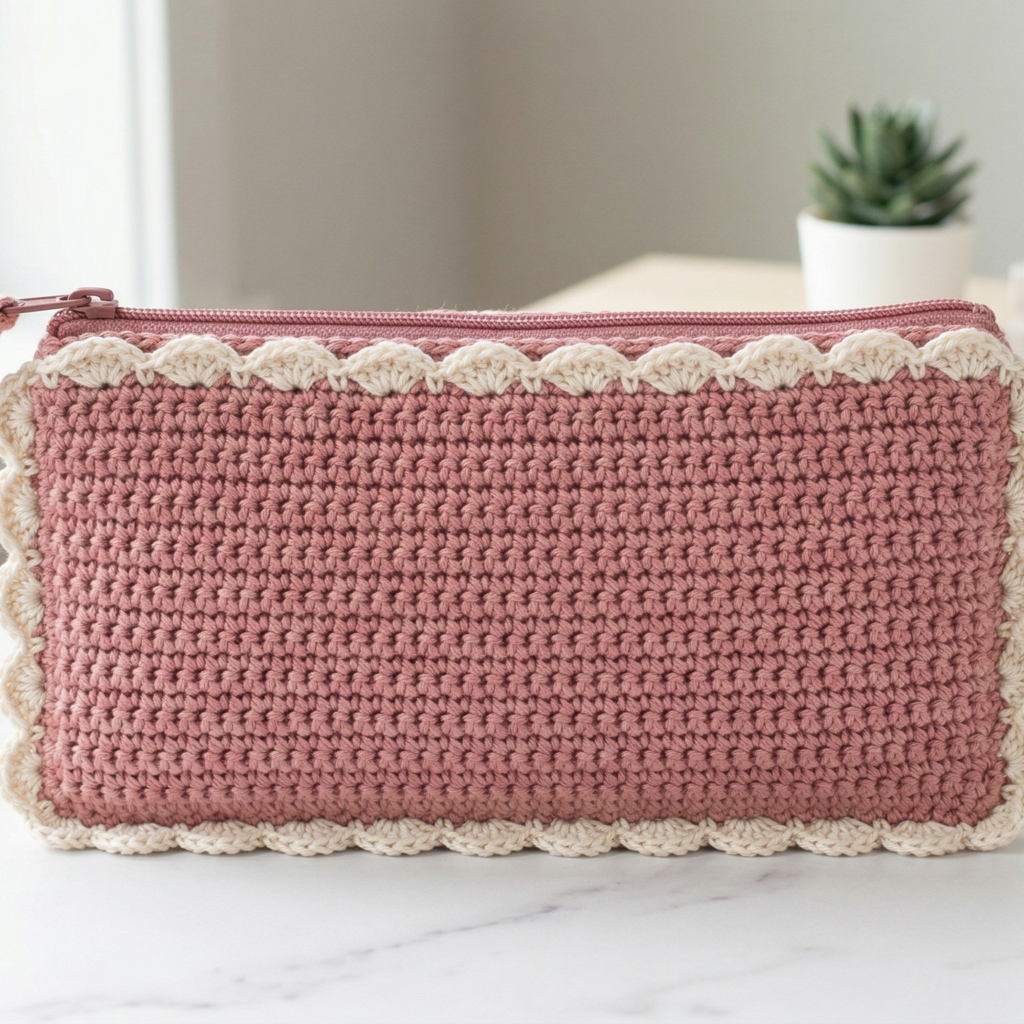 A scallop edge pencil case looks beautiful in soft neutral or pastel yarns. It is especially lovely if you want a slightly feminine, delicate style without making the project overly complex. A simple color paired with a pretty border can look very elegant.