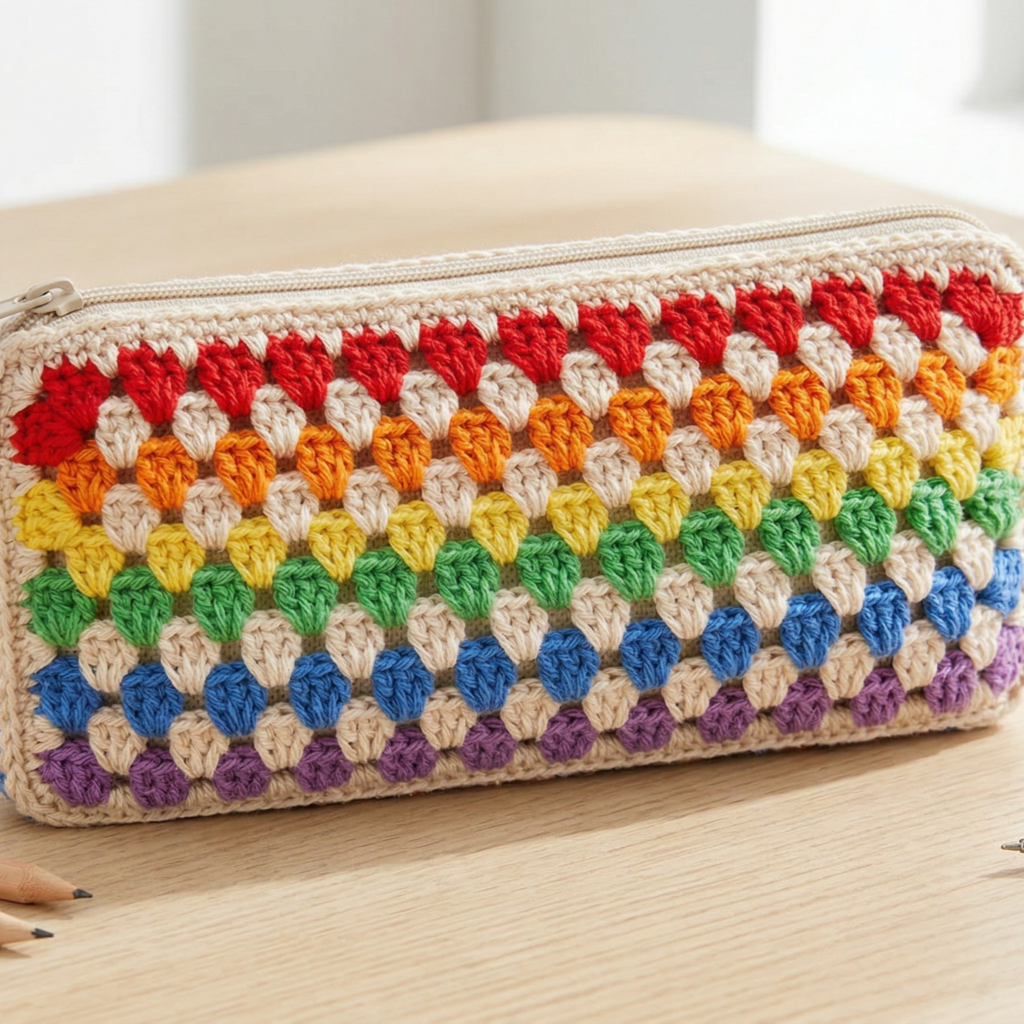 A granny stripes pencil case is classic, colorful, and easy to customize. It has that timeless crochet feel that many makers love, while the stripe pattern makes it feel fun and modern. This is a wonderful choice if you want a quick project with lots of color options.