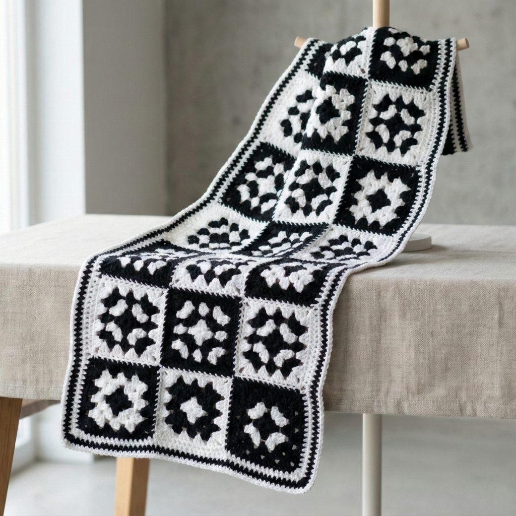 Overview & vibe: A graphic, modern scarf made of alternating black and white granny squares joined into a long strip. Bold, high-contrast and great for seasonal styling.