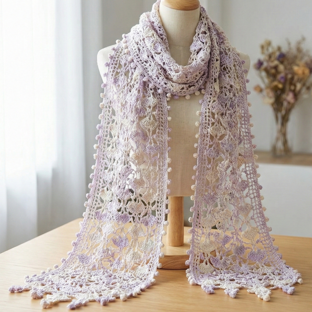 Overview & vibe: A lacy vine scarf with cascading wisteria-like cluster stitches and delicate pom-pom fringe — lightweight and romantic. Especially lovely in lace or silk blends for elegant spring/summer wear.