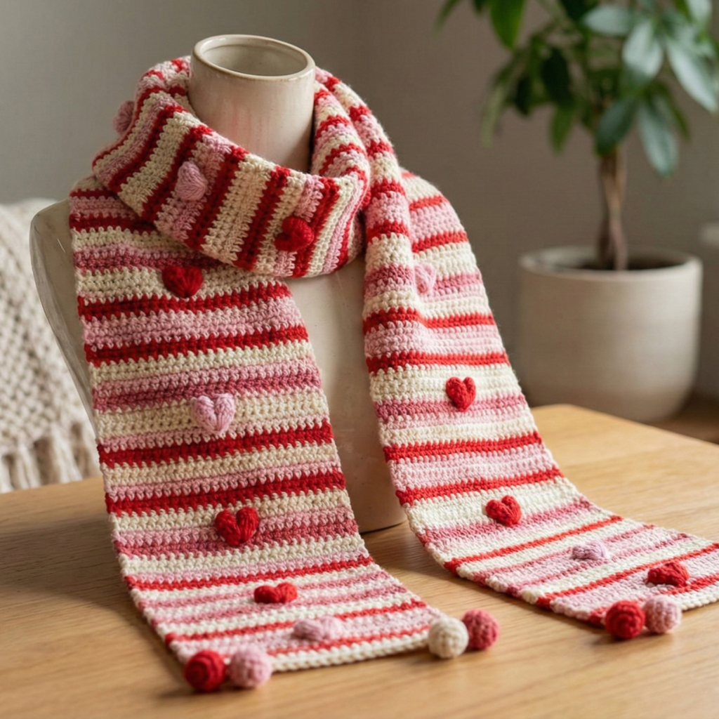 Overview & vibe: A festive scarf of narrow stripes in Valentine’s colors with heart-bobble accents and optional tassels or pom poms — playful and quick to make as a seasonal gift.