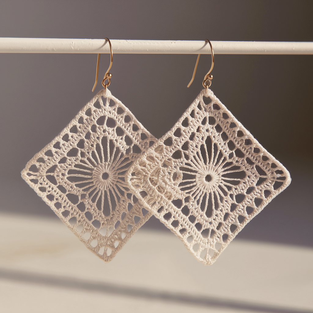 A lace square scaled down to earring size gives an instant boho-vibe — airy, tactile, and easy to dress up with a tiny bead at the corner. The technique is a small lacy filet/mesh square built in rounds so the center sits flat.