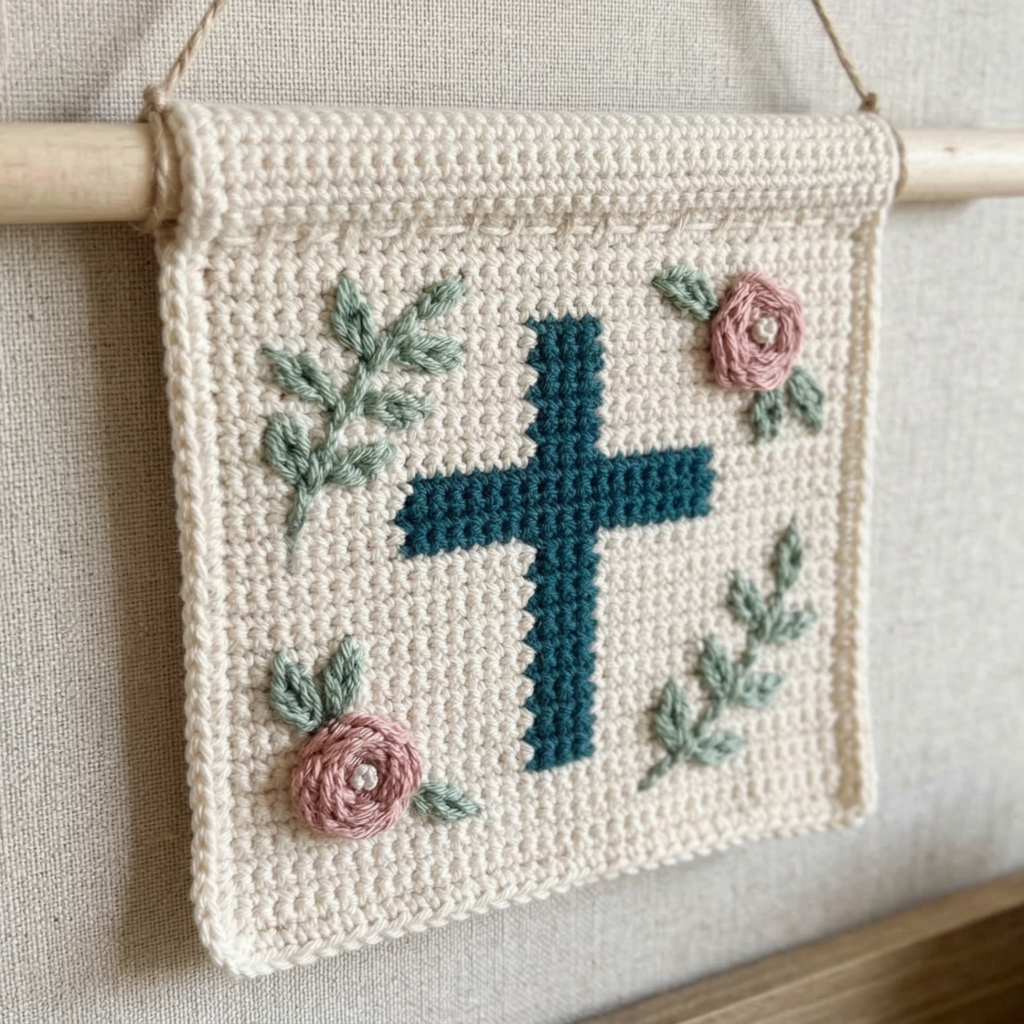 - Use tapestry crochet (sc rows) or mosaic crochet for colorwork. The motif is simple: a central cross (a few stitches wide) with small sprigs of leaves/flowers around the arms and base.