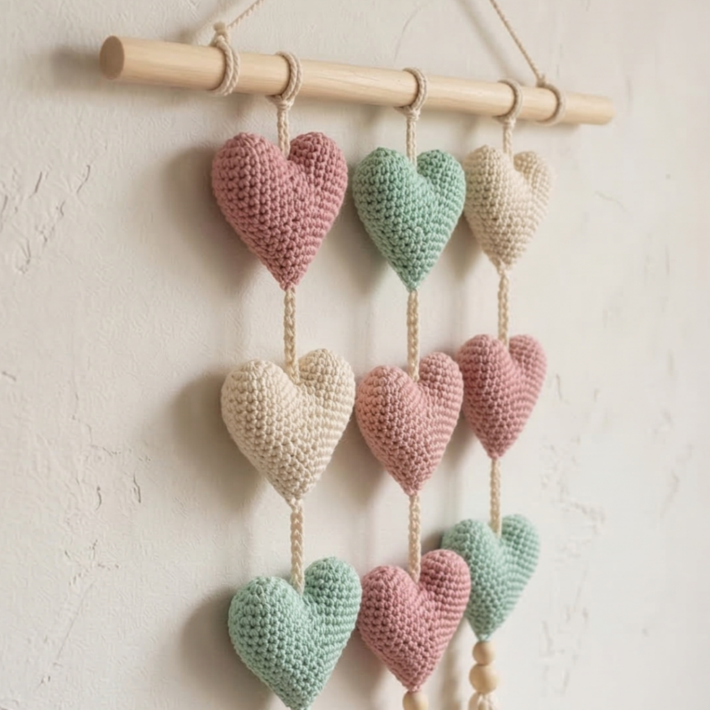 Finished size: each heart ~2.5–3″ (6–7.5 cm) wide; garland length 18–24″ with 6–8 hearts spaced small