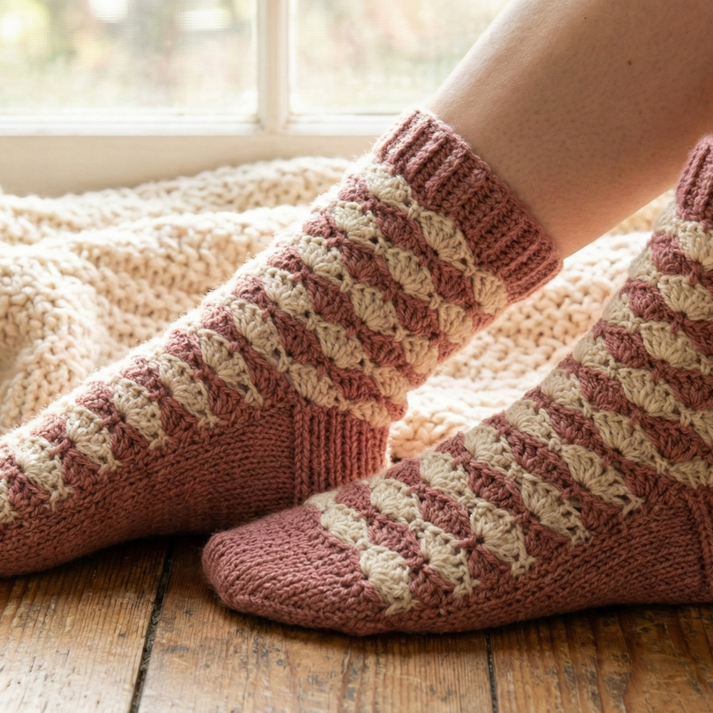Shells and waves make a pretty textured sock that reads feminine and warm. This pattern mixes shells with slip-stitch accents for structure.