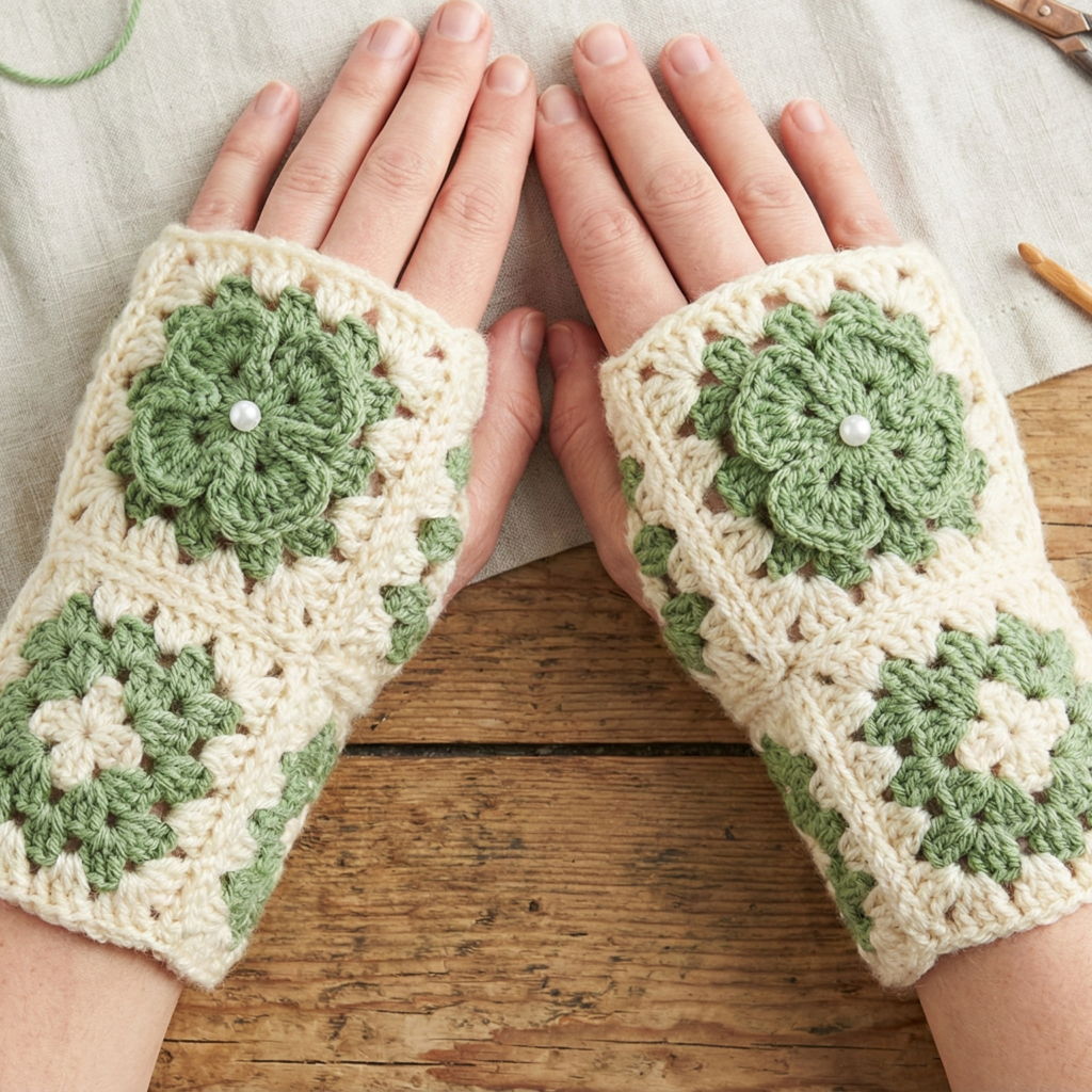 - Motif-based — join granny/hexagon motifs into a cuff shape then add a thumb opening.