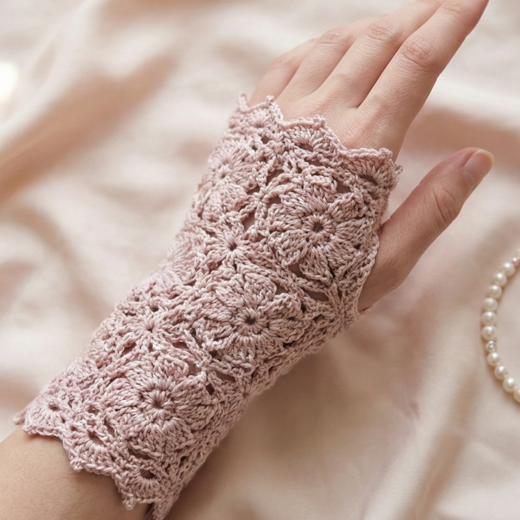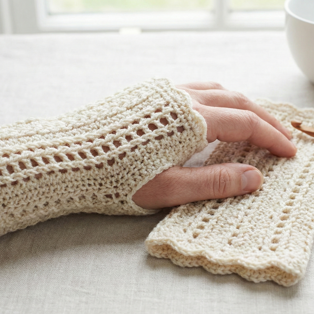 Style & concept: A lacy, knit-look wrist warmer that mimics knitted lace using crochet stitches (for example, chain-lace and treble lace repeats). Breathable, pretty and elegant for dressy winter outfits.