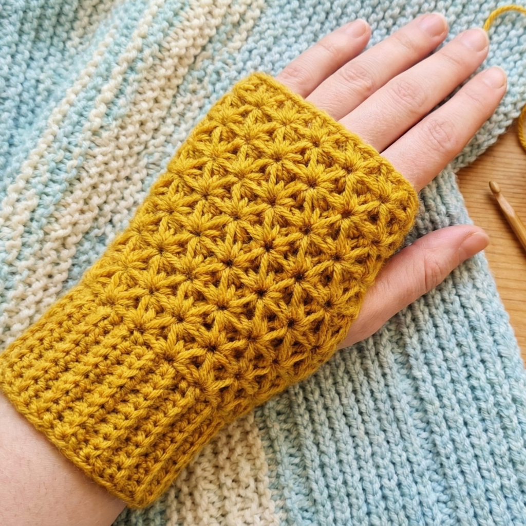 Style & concept: A cozy, textured wrist warmer using the star stitch (also called the daisy or marguerite stitch). The fabric is dense and warm but has little stretch; the star stitch makes an eye-catching honeycomb-like surface.