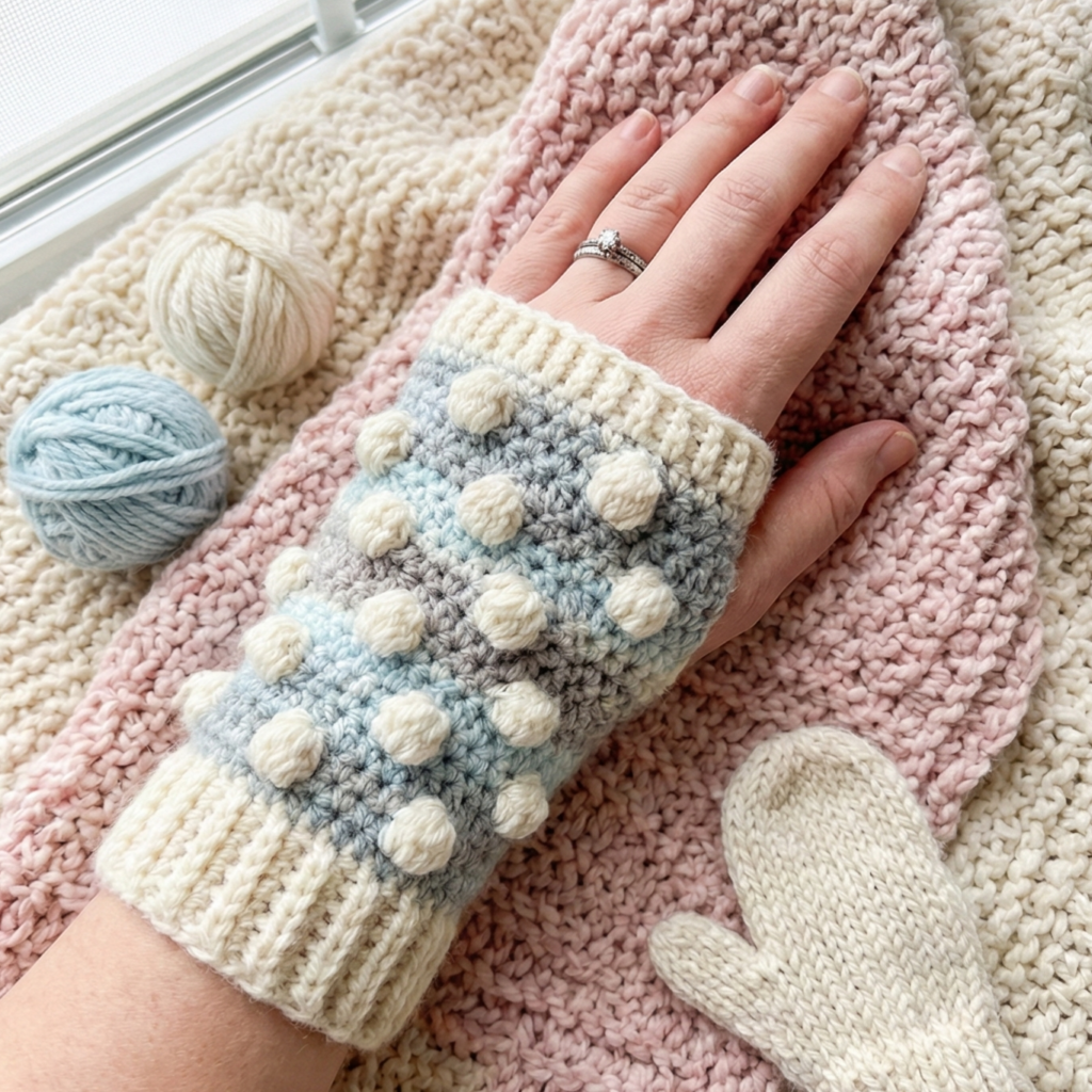 Style & concept: “Nieve” (Spanish/Italian for snow) wrist warmers use raised bobble clusters to mimic snowflake tufts — textured, cozy and very tactile. This pattern is dense and insulating.