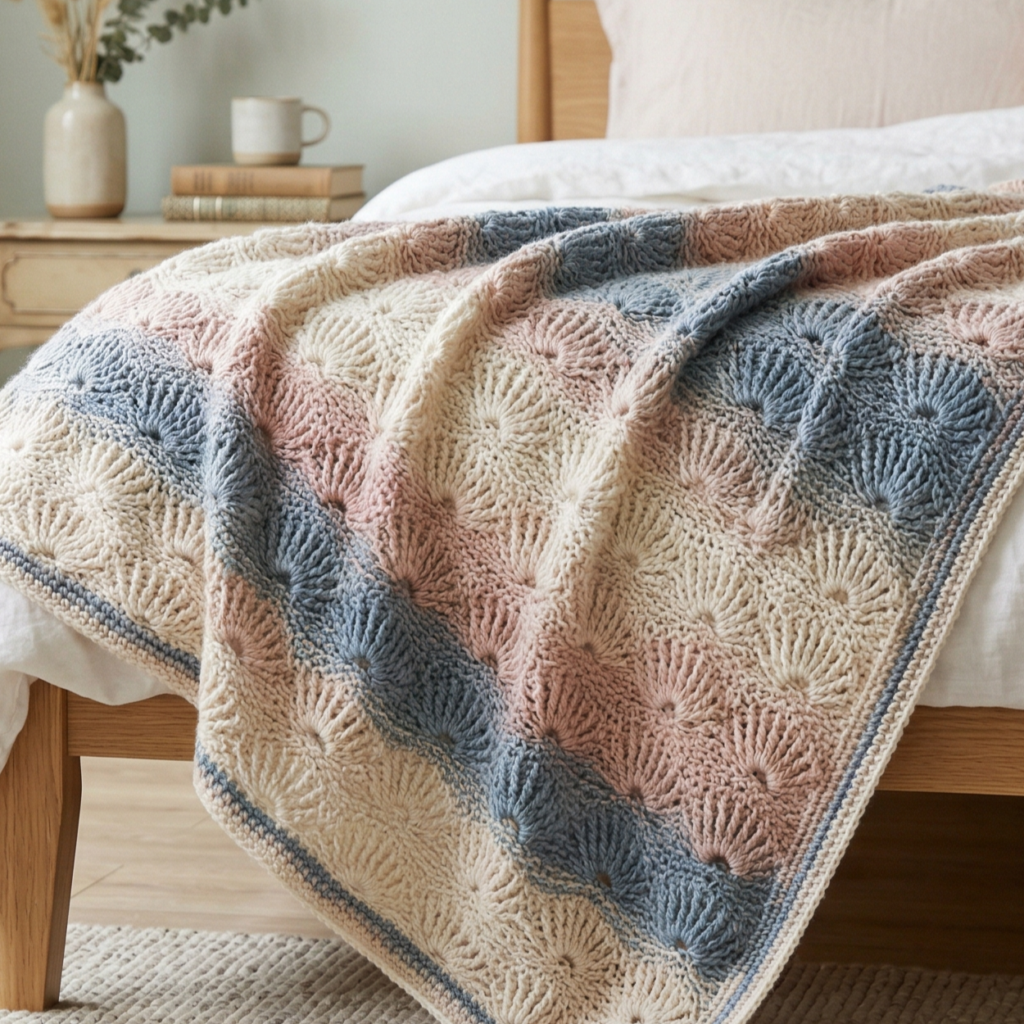 A shell blanket looks especially beautiful in soft tonal yarns or subtle color changes. If you want a romantic look, use blush, cream, or rose tones. If you want a more modern feel, keep the colors neutral and let the texture do the work.