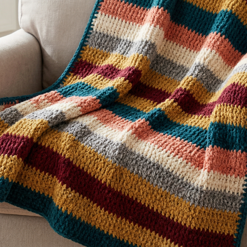 Before beginning, decide how wide each stripe should be and how many colors you want to use. Wide stripes feel bold and modern, while narrow stripes feel delicate and busy in a charming way. A two-color blanket is often the easiest place to start.