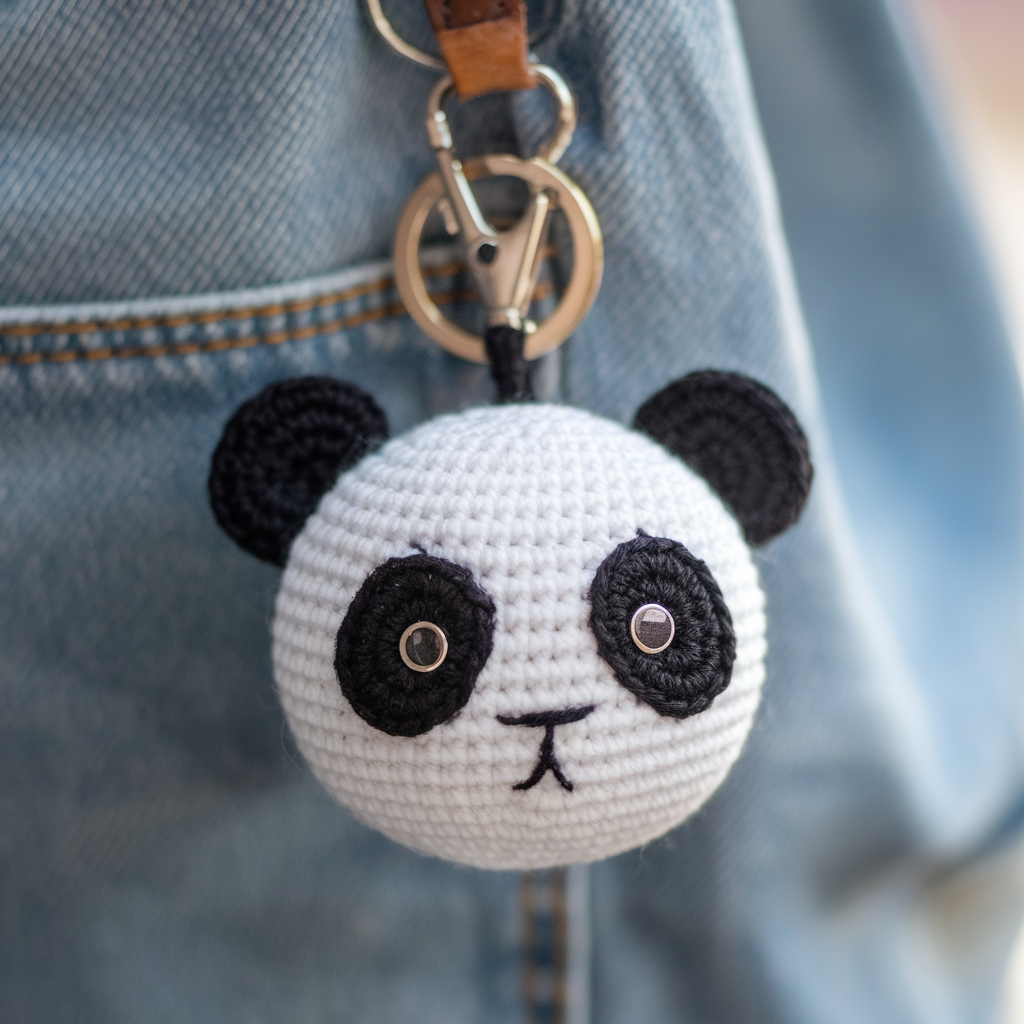 - For keyring loop: at the crown before final stuffing/closing, make a small crocheted loop: attach yarn and ch 8–10, sl st to base to create loop (or ch 4 and sl st back to make tighter loop). Pull loop through split ring and sew the loop’s base securely into the top of the head with several passes. Alternatively use a short metal chain: sew one end of chain firmly into top of head and weave tail through several times.