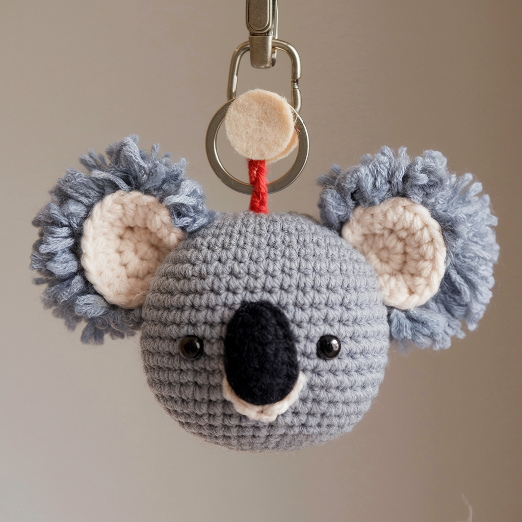 - Sew features securely. Add keyring at top by crocheting a small loop or stitching a metal ring into the top of body before final closing; back with a small felt disc inside for strength.